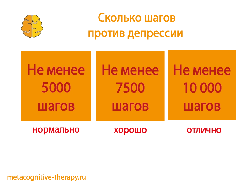 Кроме того, постепенное увеличение активности показало дополнительные преимущества: количество шагов выше 7500 связано с еще большим снижением симптомов депрессии. Проспективные когортные данные показали, что люди, совершающие 7000 и более шагов в день, имеют заметно меньший риск развития депрессии по сравнению с теми, кто делает меньше шагов. В частности, каждые дополнительные 1000 шагов в день соответствовали снижению риска депрессии на 9%.