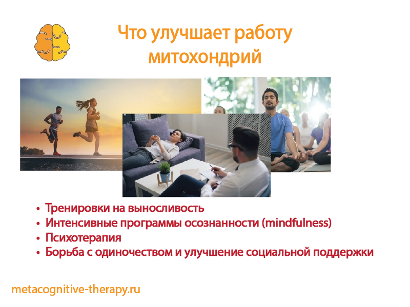 Другие вмешательства также показывают потенциал. Интенсивная программа осознанности снизила тревожность и изменила активность митохондрий, хотя другие маркеры стресса остались без изменений (Gomutbutra et al., 2022). Психотерапия увеличила количество митохондрий у пациентов с ПТСР, но эти изменения не коррелировали с улучшением симптомов (Hummel et al., 2023). Хотя осознанность и психотерапия могут улучшать функцию митохондрий, для подтверждения этих предварительных результатов необходимо больше исследований.