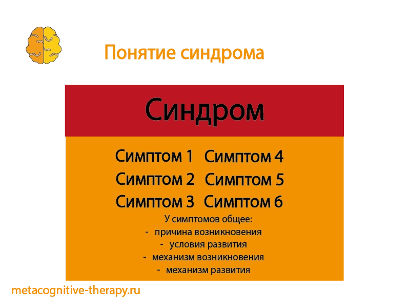 Синдром — это совокупность симптомов с общими причинами и условиями их развития и механизмом возникновения (т. е. с общей этиологией и патогенезом).