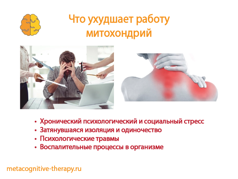 Митoхoндрии также могут быть связующим звеном между стрессом, воспалением и целым рядом психических и когнитивных расстройств. Хронический стресс постепенно снижает эффективность митохондрий, что приводит к нарушению энергетического баланса, усилению воспаления и ухудшению передачи сигналов в мозге, что может объяснять, как стресс способен вызывать усталость, когнитивные трудности и нарушения настроения. Различия в работе митохондрий также могут объяснять, почему некоторые люди более уязвимы к стрессу, чем другие.