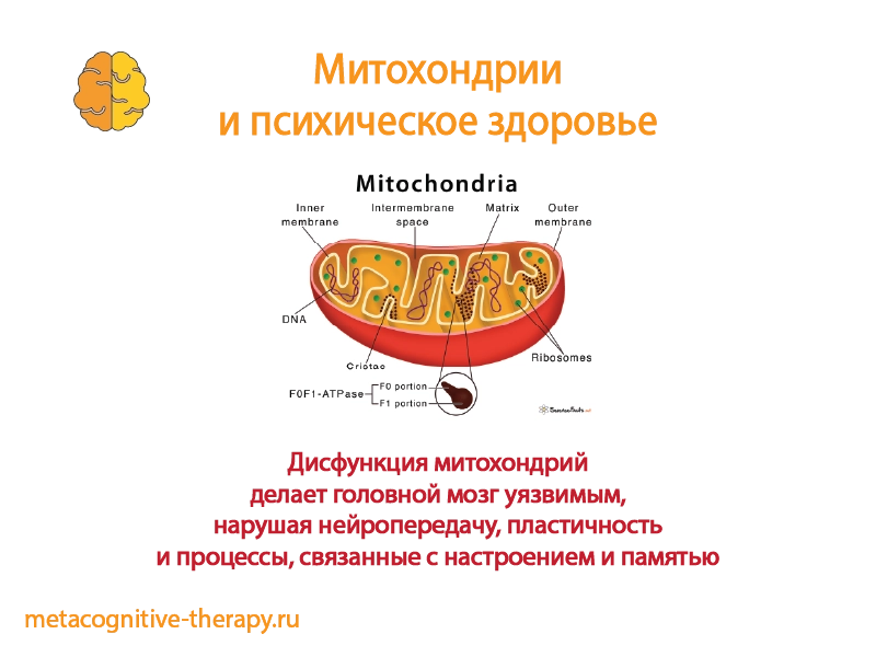 Высокая потребность мозга в энергии делает его особенно уязвимым к дисфункции митохондрий. Если митохондрии работают менее эффективно, на передачу нервных импульсов и пластичность остаётся меньше энергии, что влияет на процессы, поддерживающие регуляцию настроения и память. Вариации в митохондриальной ДНК, которая помогает контролировать функцию митохондрий, связаны с повышенным риском развития тревожности и депрессии.
